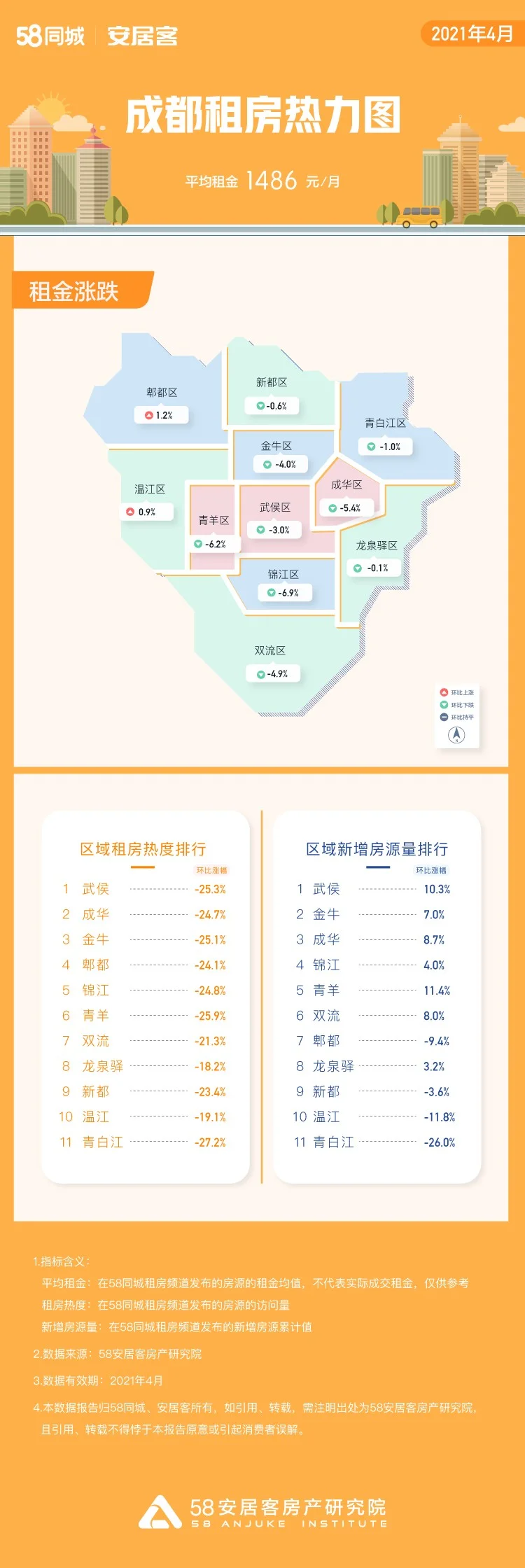58安居客房产研究院监测数据显示,新一线城市中成都4月份新增房源量方面,11区中除郫都区、新都区、温江区和青白江区外,其他各区环比均出现不同程度的上涨,其中青羊区环比涨幅为11.4%,领先其他区域,金牛区、成华区、双流区环比涨幅也均超5%。成都4月份平均租金为1486元/月,郫都区环比涨1.2%,领先其他区域。