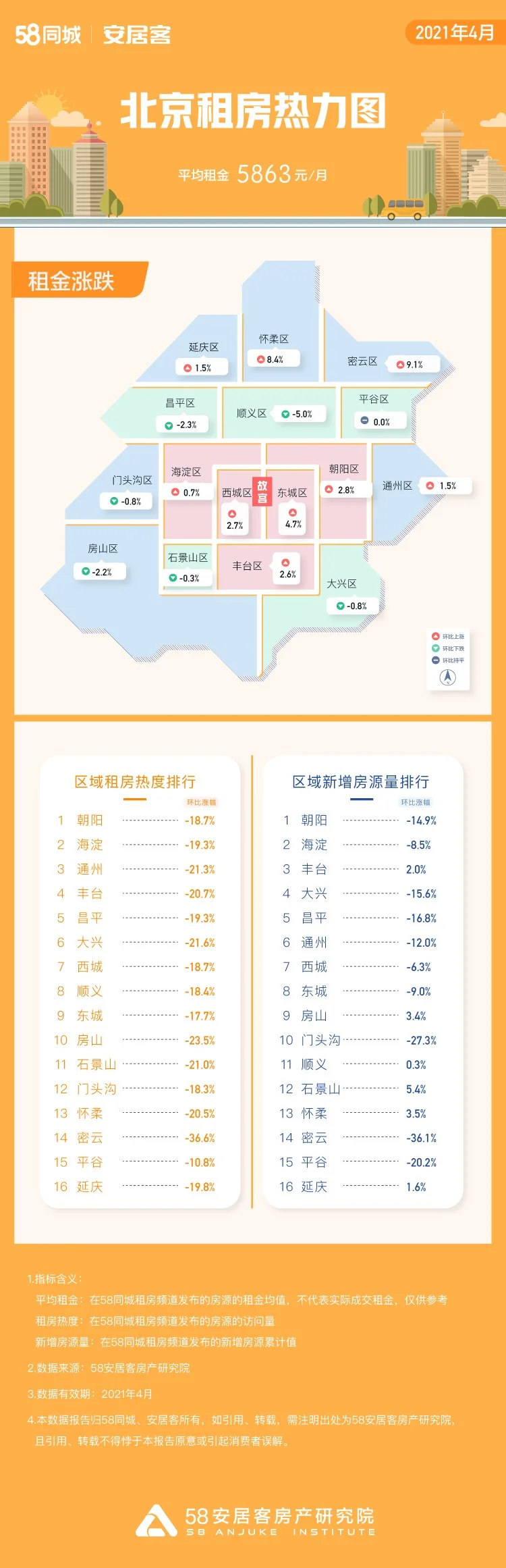 58同城、安居客《4月重点城市租房趋势报告》显示,北京市平均租金为5863元/月,密云区平均租金环比涨幅最高为9.1%,其次为怀柔区,平均租金环比涨幅为8.4%。除了部分郊区外东城区、西城区、海淀区、朝阳区和丰台区平均房租环比均出现不同程度的上涨。新增房源量方面,石景山区出现5.4%的环比涨幅领跑其他区域;怀柔区环比涨幅紧随其后,达到3.5%。