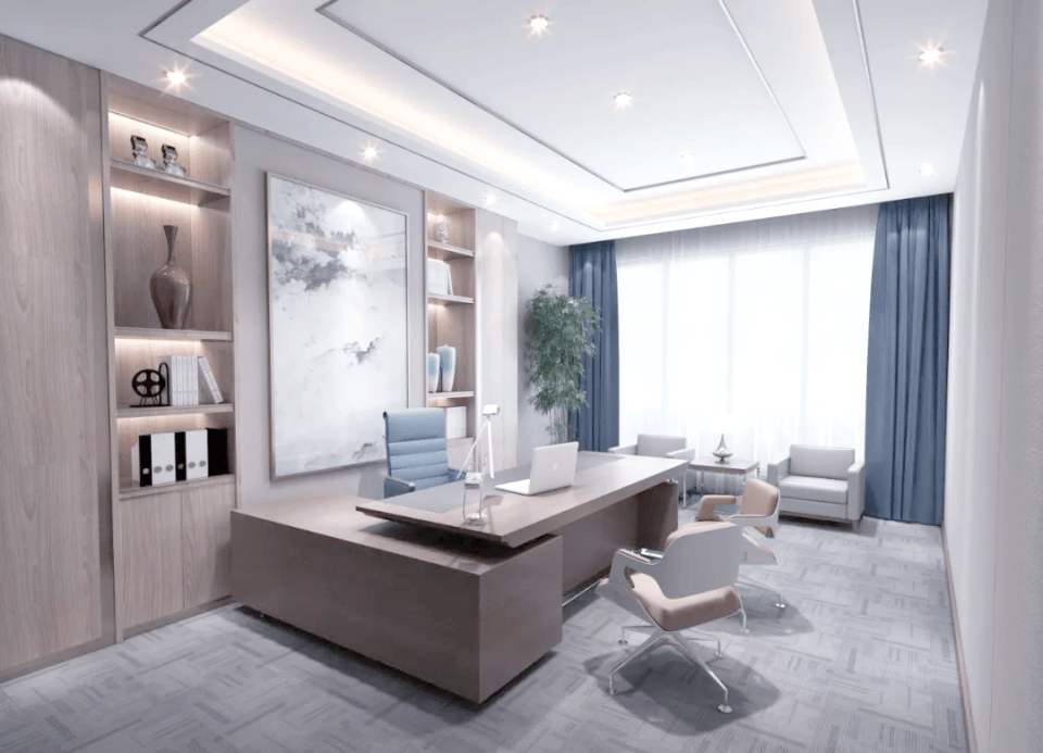 - 明堂开阔:前台接待区应宽敞明亮,天花板高度适中,地面铺设浅色系石材或地毯以延伸视觉空间。财务室、老板办公室建议设在相对隐蔽的后方位置,体现层级秩序。