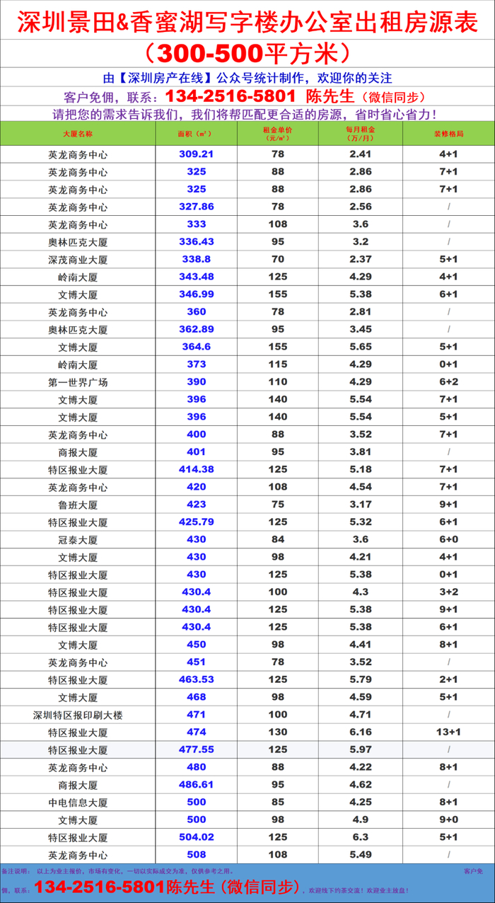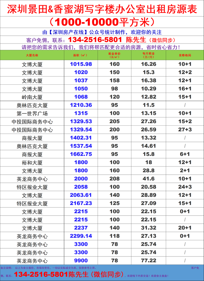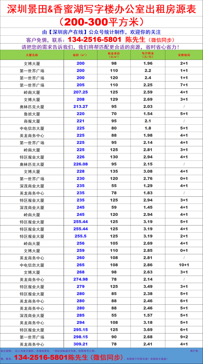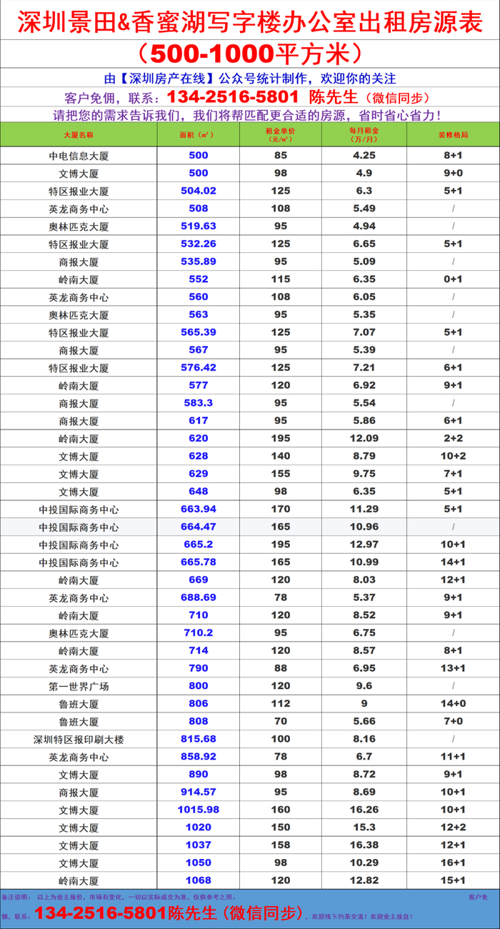 福田区景田及香蜜湖片区写字楼办公室出租房源信息表&租金价格表