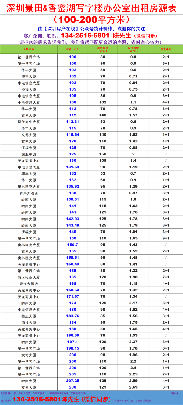 深圳福田区景田及香蜜湖片区100-200平米写字楼出租招租赁信息