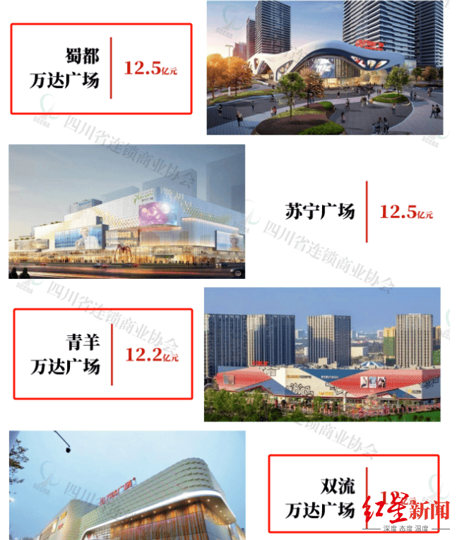据四川省连锁商业协会发布的2023年成都主要商业综合体及购物中心业绩榜单,2023年蜀都万达、青羊万达、双流万达分别营收12.5亿元、12.2亿元、12亿元,居于榜单的第26名、28名、29名。