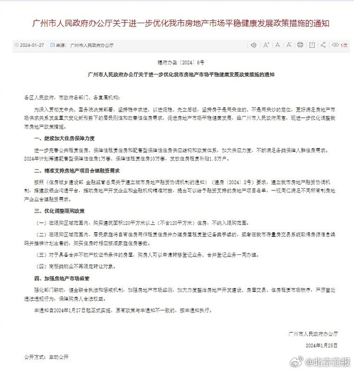 【#广州出租或出售房子可获新购房名额# ,全市120平米以上住房随便买】#中介称广州实际等同全面放开限购# 据@第一财经日报 报道,又有一线城市对楼市进行松绑。1月27日,广州市政府办公厅印发《关于进一步优化我市房地产市场平稳健康发展政策的通知》(以下简称为“《通知》”),提出继续加大住房保障力度、精准支持房地产项目合理融资需求、优化限购、加强房地产市场监管等政策措施。