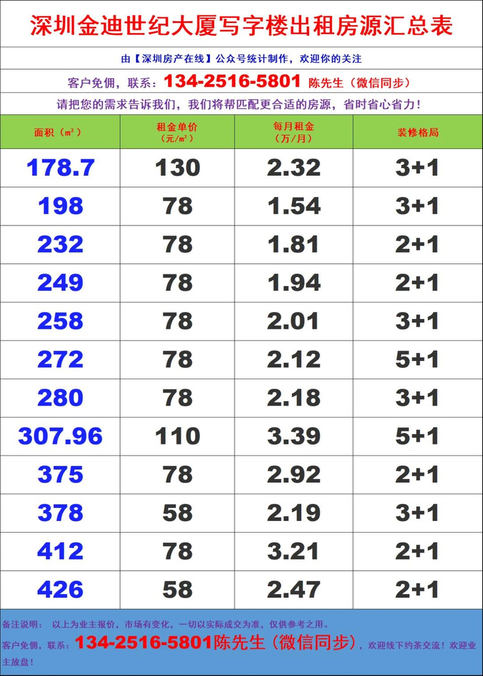 深圳金迪世纪大厦写字楼办公室租金价格表