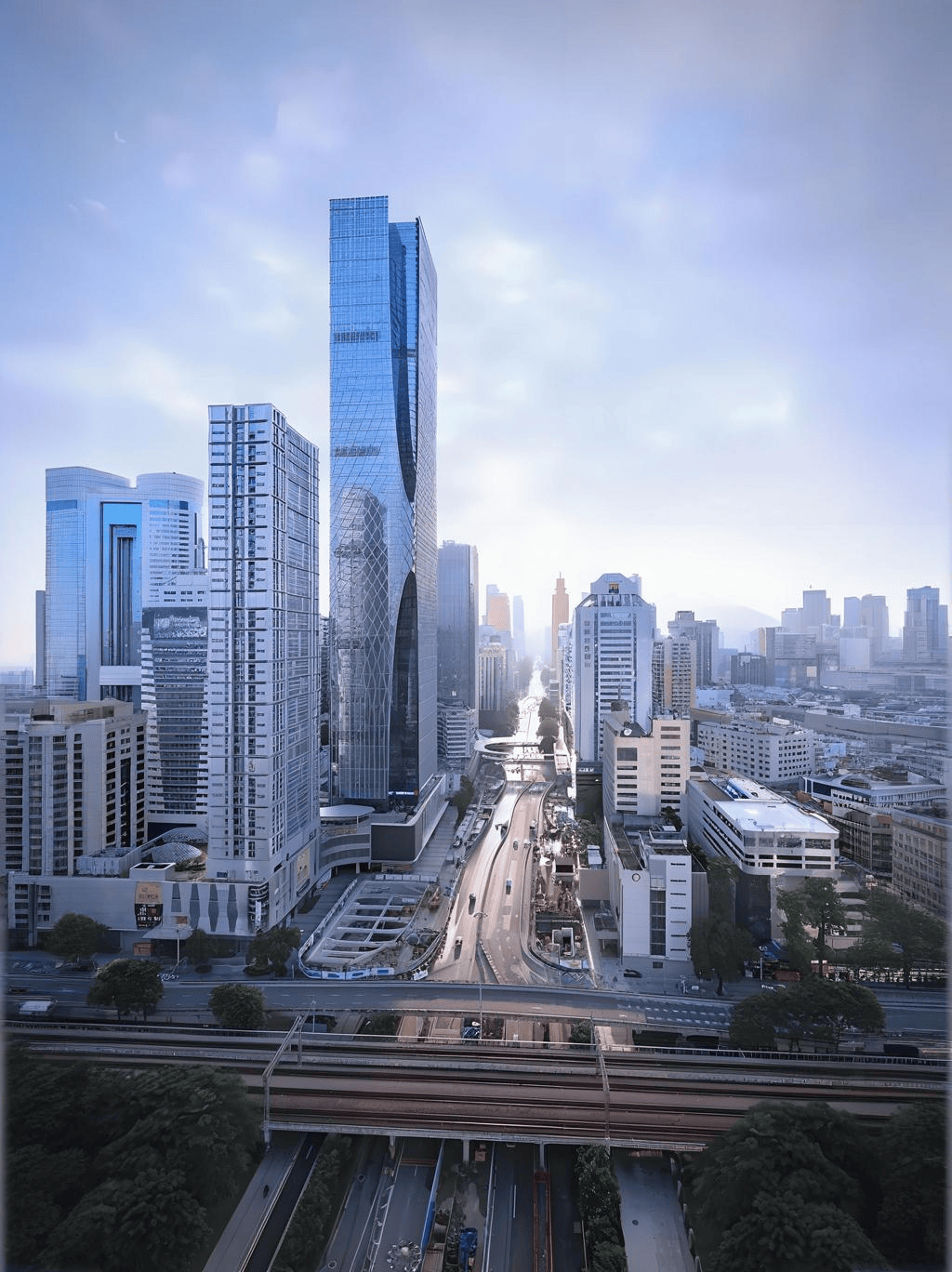 塔楼设计为“水流”动感形态,U型切割立面形成“城市森林”概念;