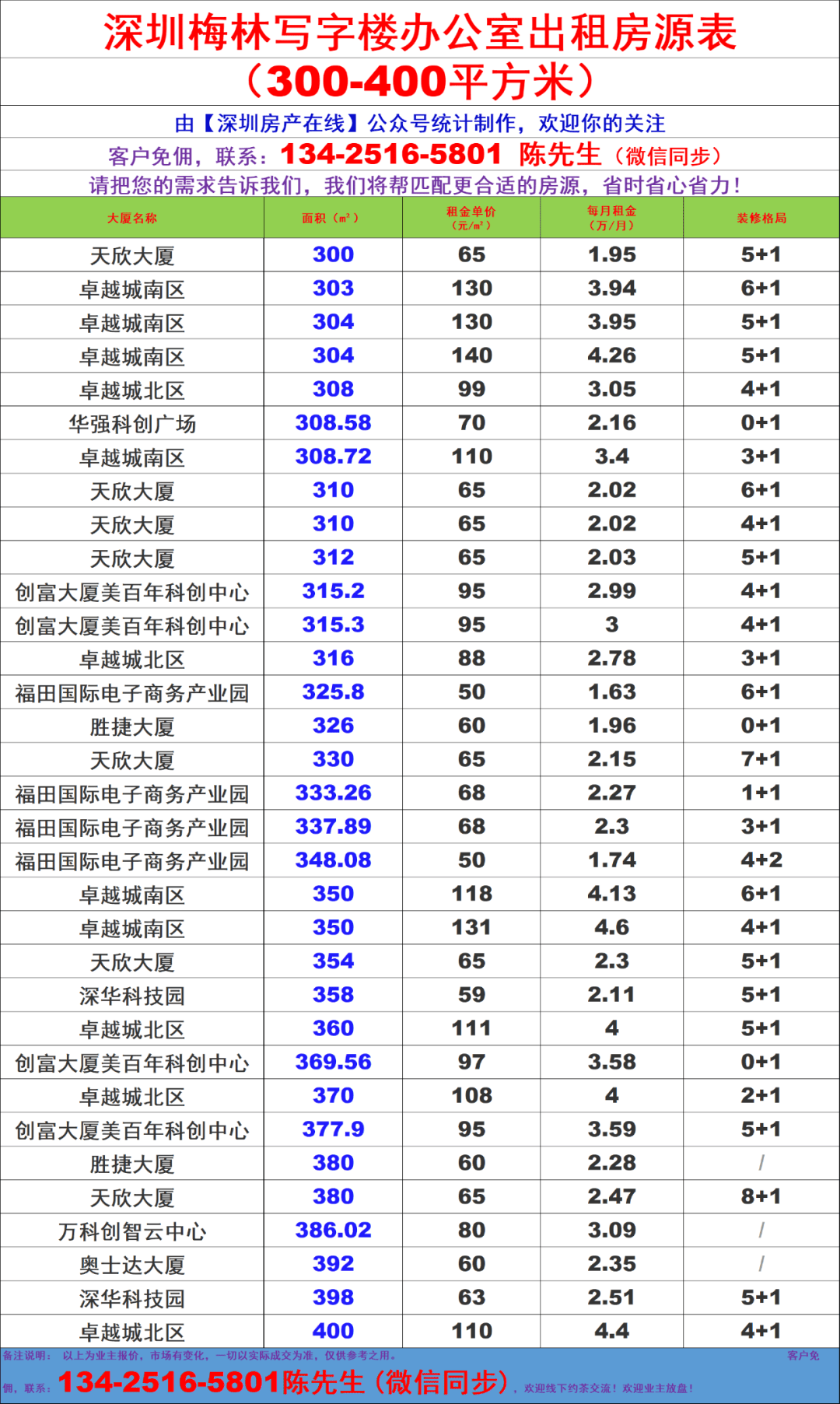 福田区梅林片区写字楼办公室出租房源信息表&租金价格表