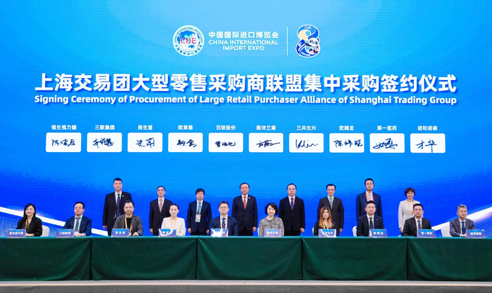 11月8日,作为第八届进博会配套现场活动,由百联集团主办的上海交易团大型零售采购商联盟集中采购签约仪式在国家会展中心(上海)举办。百联集团携大型零售采购商联盟成员企业与来自美洲、欧洲、大洋洲、亚洲等国家和地区的厂商及品牌商代表进行集中签约,采购涵盖食品家居、美妆个护、医疗器械等多个民生领域。