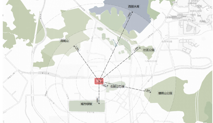 项目基地周围景观资源丰富,西北方向有洞尾山景观,东北方向有西丽水库与社区公园绿地景观,东面有塘朗山公园与石鼓山公园景观,南面有区域规划城市绿轴。而西面会形成以高层、超高层总部办公楼为主的城市景观。视野开阔,具有优势。
