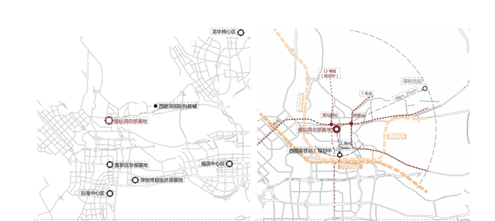 留仙洞总部基地是深圳唯一的双高铁枢纽的总部基地。该基地毗邻西丽高铁站(规划中)与深圳北站,分别位于5分钟与25分钟车行范围圈内;有5号线与13号线(规划中)经过基地附近留仙洞站,毗邻7号线经过西丽站;另有南光高速和粤港澳高速相邻,从交通上提升留仙洞总部基地于深圳与粤港澳大湾区的战略地位。