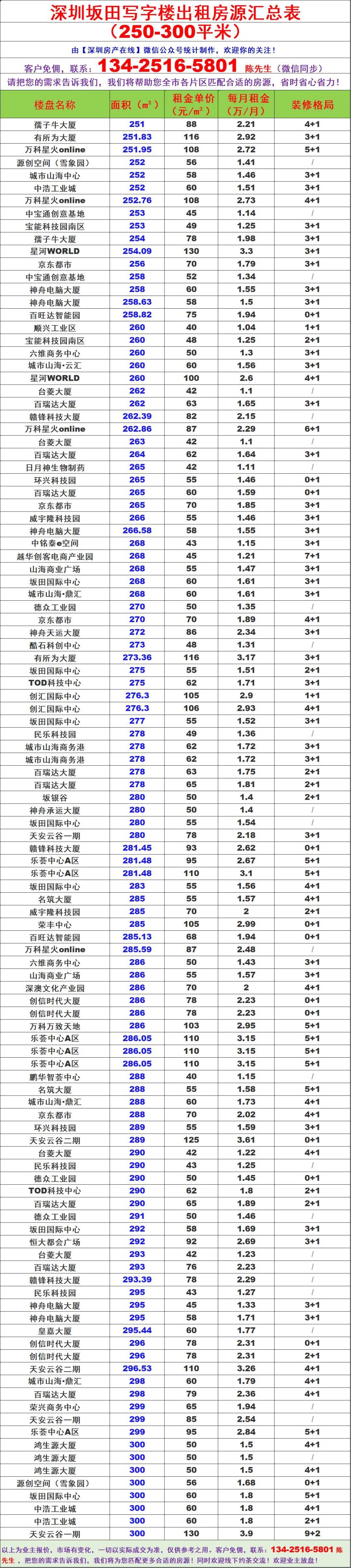 深圳龙岗坂田写字楼办公室出租房源信息表&租金价格表
