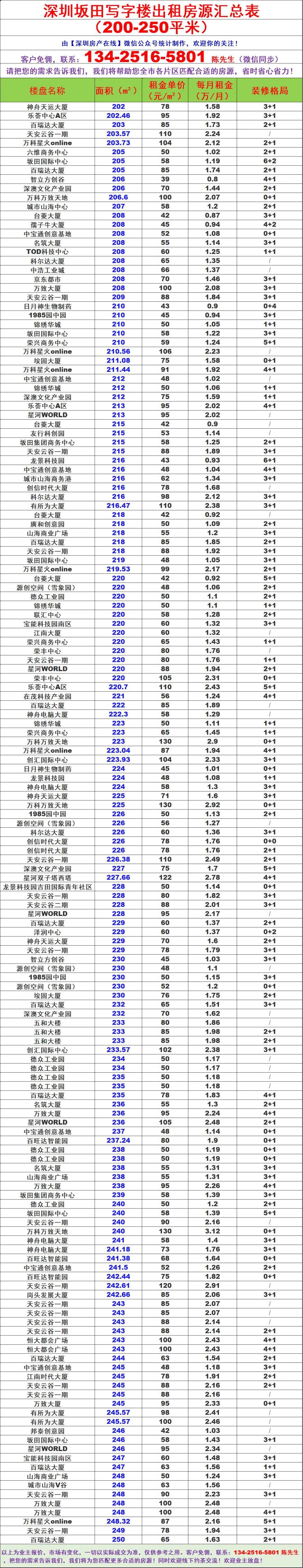 龙岗坂田片区写字楼办公室出租房源信息表&租金价格表