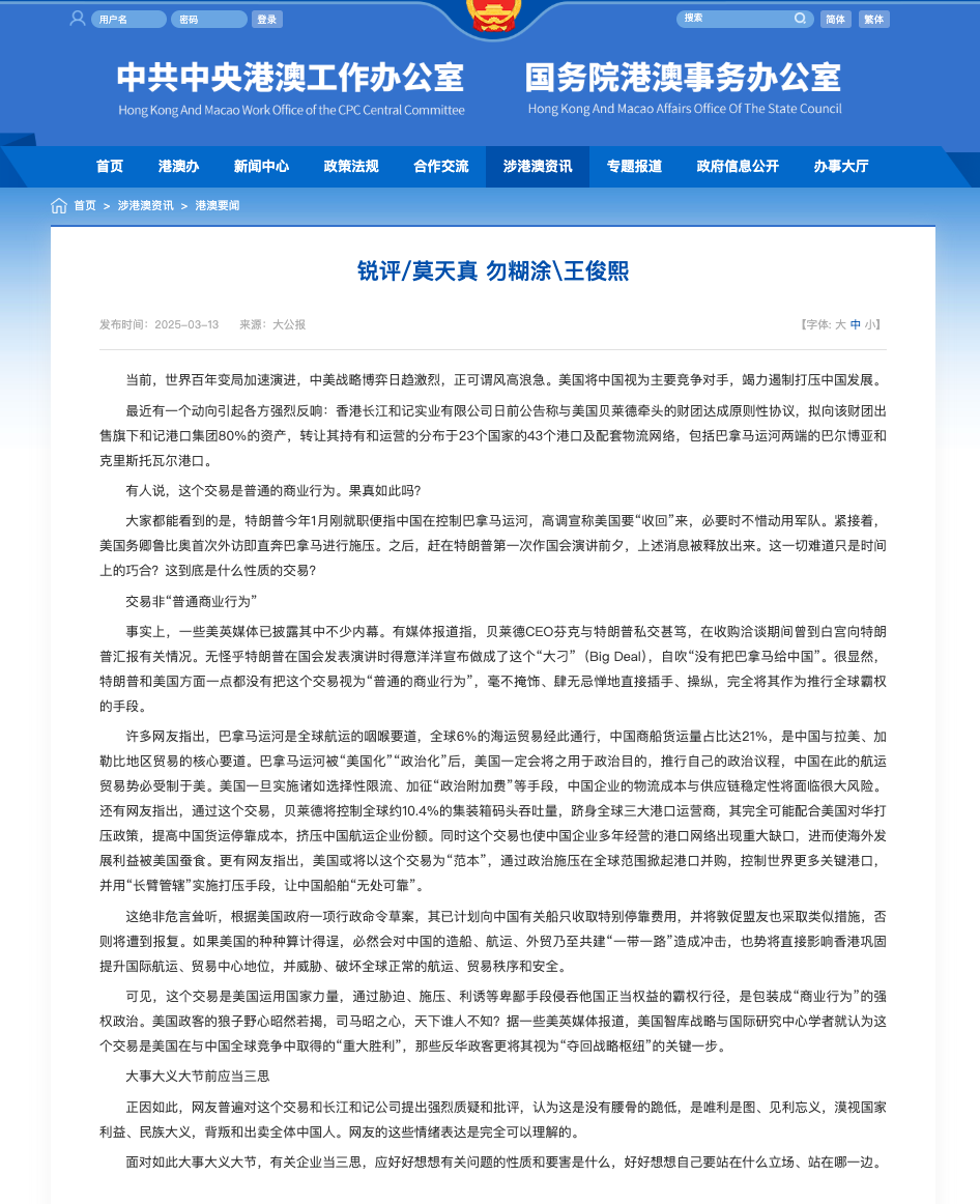 大家都能看到的是,特朗普今年1月刚就职便指中国在控制巴拿马运河,高调宣称美国要“收回”来,必要时不惜动用军队。紧接着,美国务卿鲁比奥首次外访即直奔巴拿马进行施压。之后,赶在特朗普第一次作国会演讲前夕,上述消息被释放出来。这一切难道只是时间上的巧合?这到底是什么性质的交易?