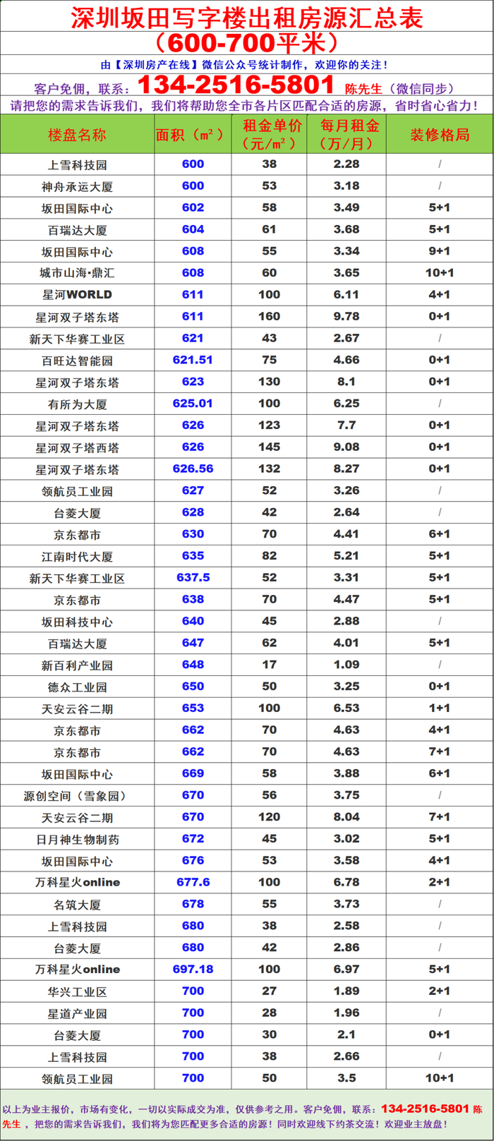 深圳龙岗坂田600-700平米写字楼出租招租赁信息