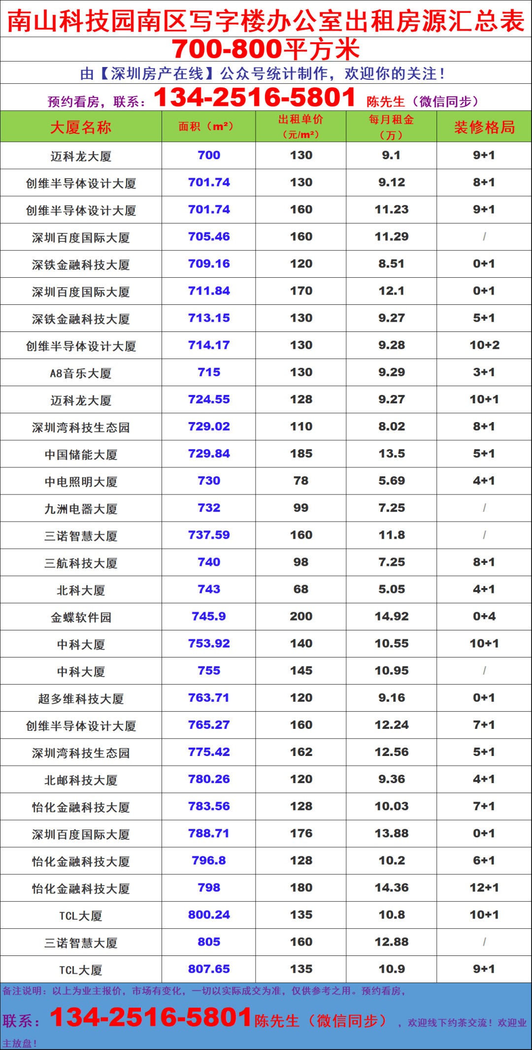 南山科技园南区写字楼办公室出租房源信息表&租金价格表