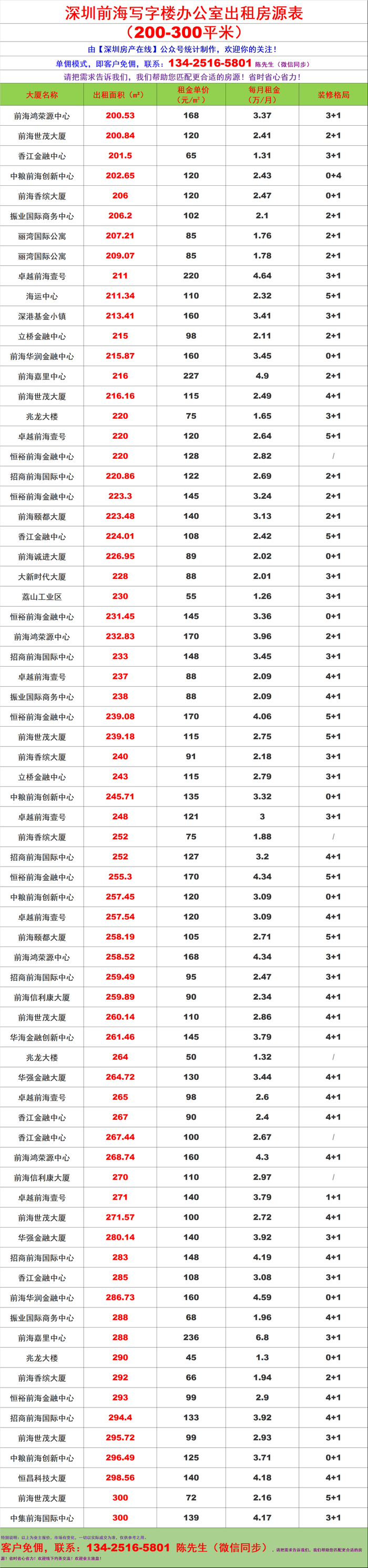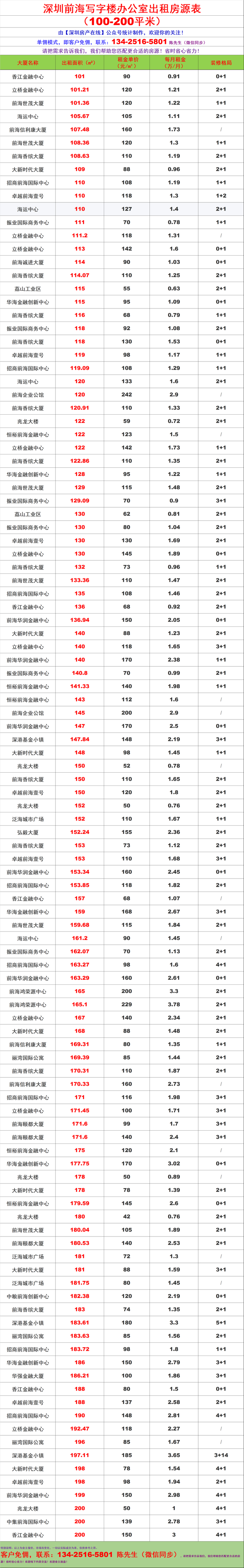 深圳前海写字楼办公室出租房源信息表&租金价格表