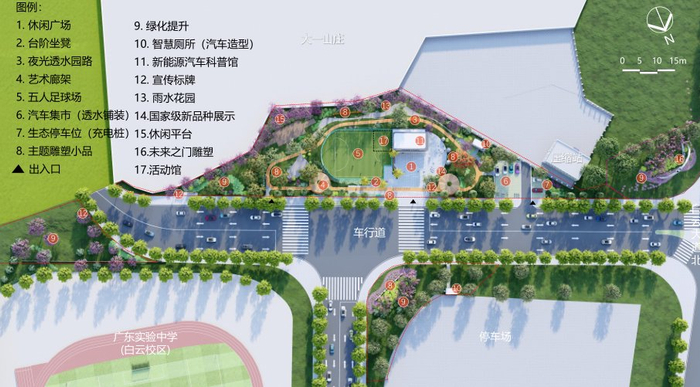 公园设计整体俯瞰呈汽车造型据介绍,公园设计契合白云汽车大道的定位和产业特色,整体俯瞰呈汽车造型。建成后的公园有运动休闲和科普两大功能空间,一是采用废弃木料、金属、砖石等材料进行循环多功能利用,设置小型足球场、夜光酷跑步道、便民公厕等设施,为市民打造环保、舒适、休闲运动空间。二是围绕汽车文化、新能源技术、废料再利用,建设汽车科技文化科普展厅、建筑废料循化利用科普展厅、汽车集市、无人驾驶体验道路,定期开展汽车和废物利用科普活动、车企品牌交流和新品发布活动、新能源科技讲座等,打造白云区汽车与废料循环利用文化地标。