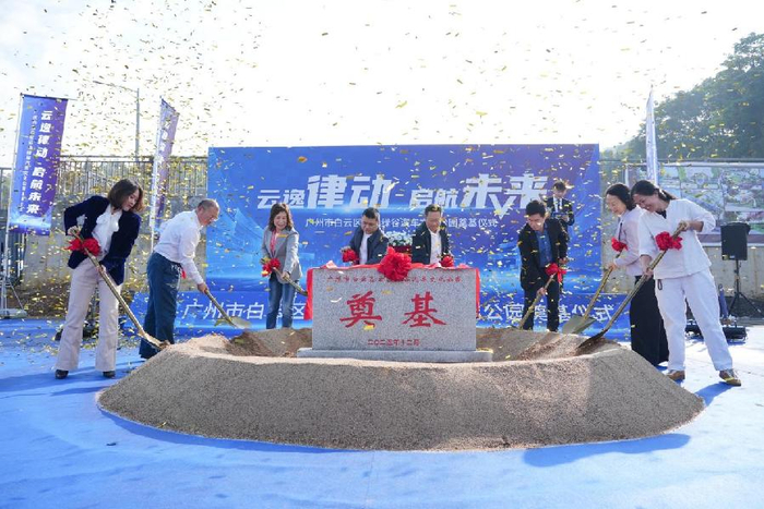 现场举行了签约仪式,白云区城管局主要负责人与相关企业董事长先后致辞,表达这场“双向奔赴”背后绿美惠民、以绿兴业的初心和愿景。随后,领导嘉宾们手持铁锹,共同将沙土培入基石,为这块闲置绿地“焕发新生”奠基。