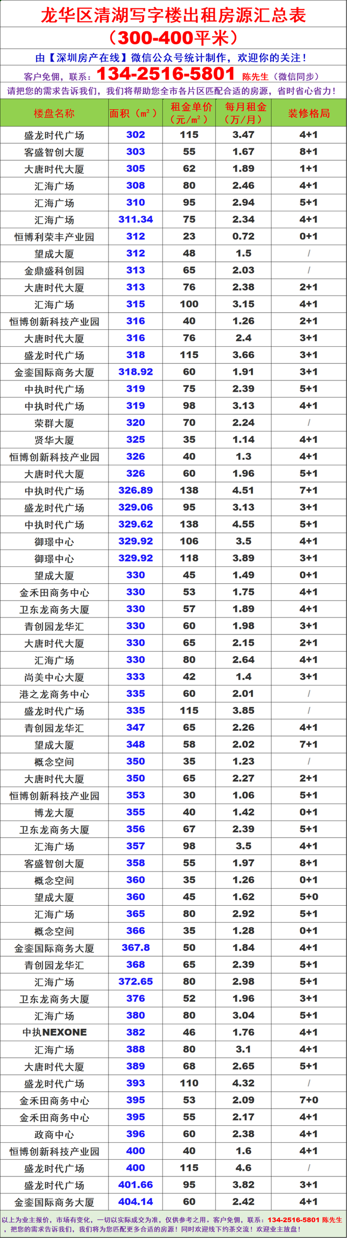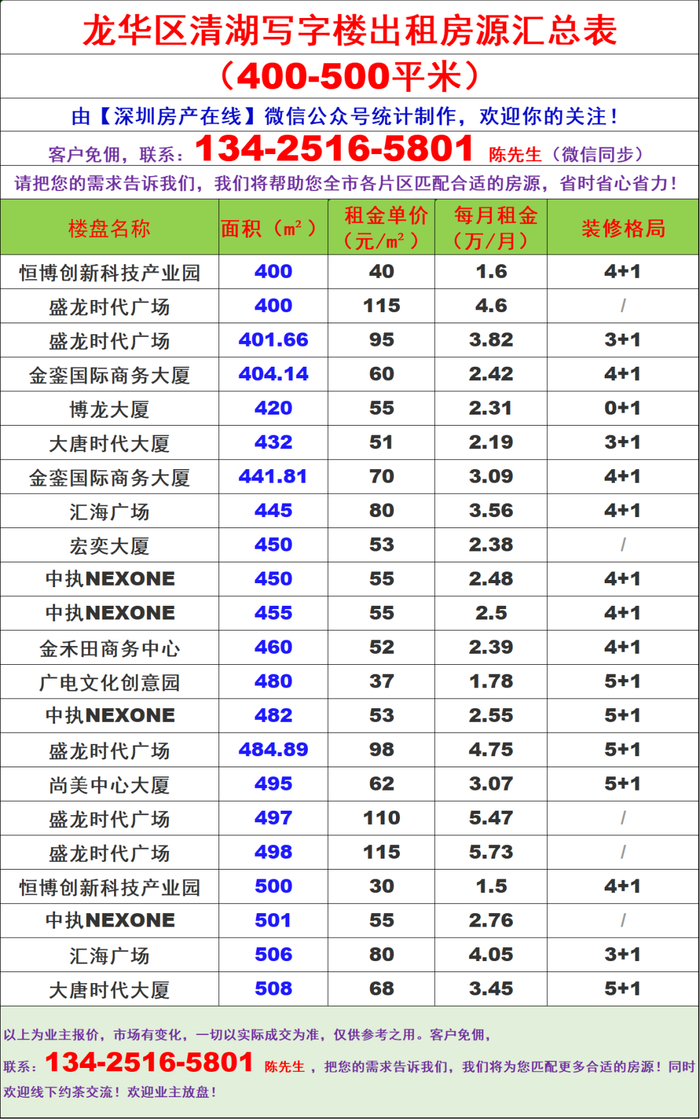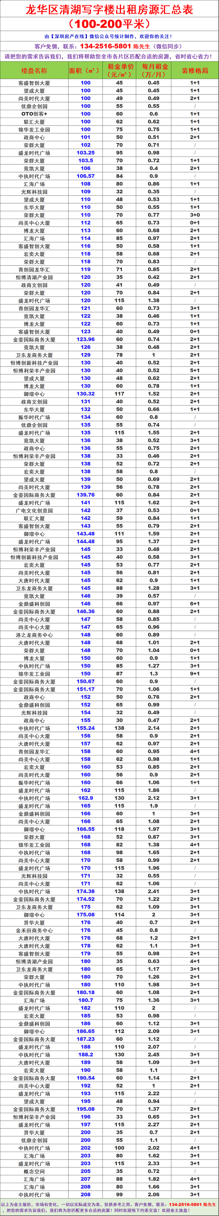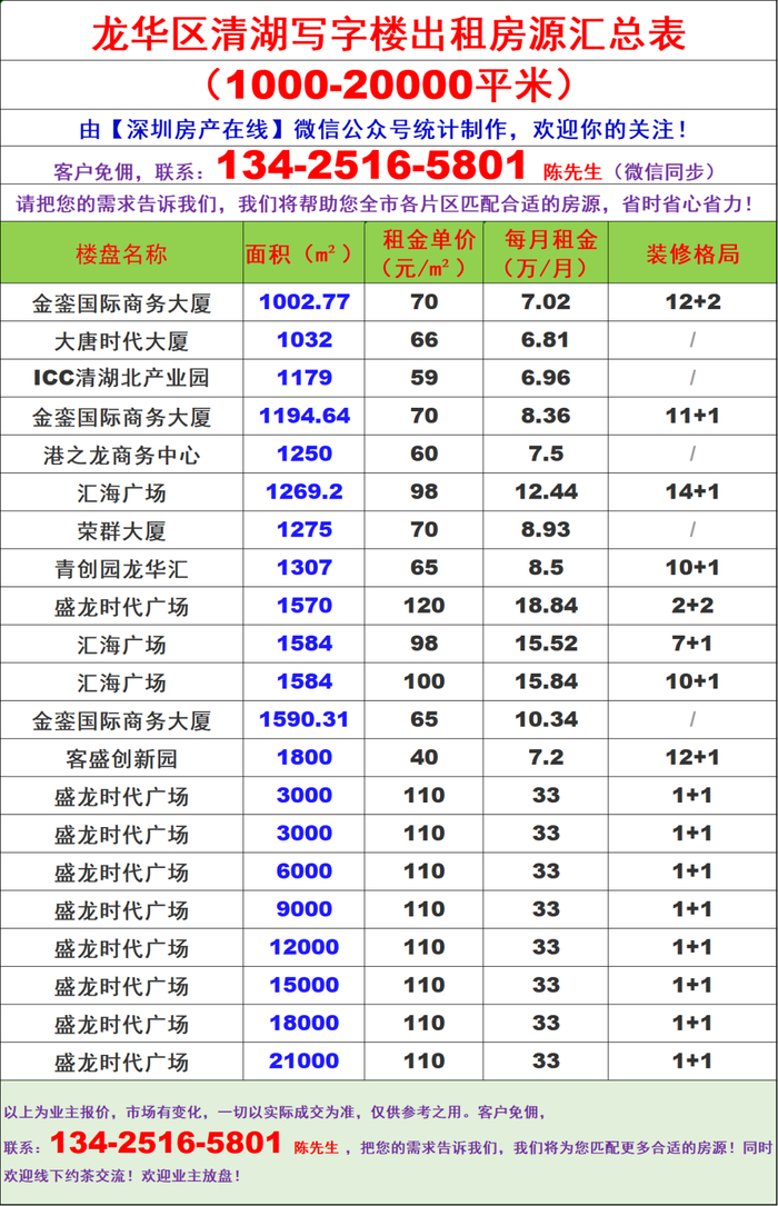 深圳龙华区清湖写字楼办公室出租房源信息表&租金价格表