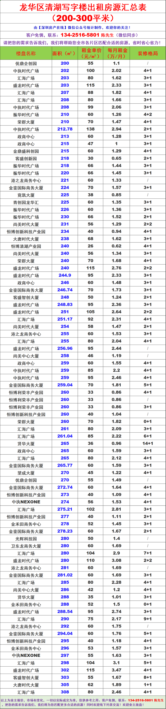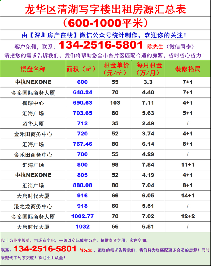 龙华区清湖写字楼办公室出租房源信息表&租金价格表