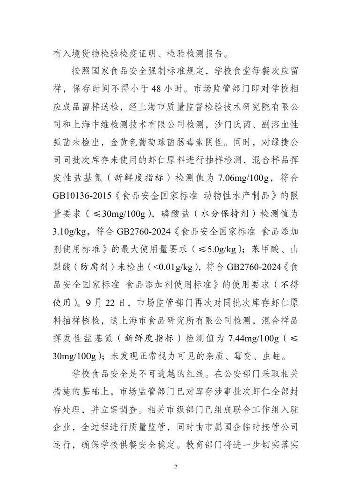9月16日,关注到相关舆情后,市场监管部门和教育部门立即对受影响的学校和食品进行排查。经查:绿捷公司9月15日共向全市211所学校供应涉虾仁相关菜品,接到异常情况报告后逐一电话通知停止供应。其中,161所学校回收了相关原料、半成品及成品菜品,50所学校在接到通知前已供餐。涉事虾仁为进口“冷冻南美白虾虾仁”,由上海翰霖实业有限公司报关,经上海优合鲜供应链有限公司向绿捷公司供应,生产日期为2025年3月20日,保质期24个月,有入境货物检验检疫证明、检验检测报告。