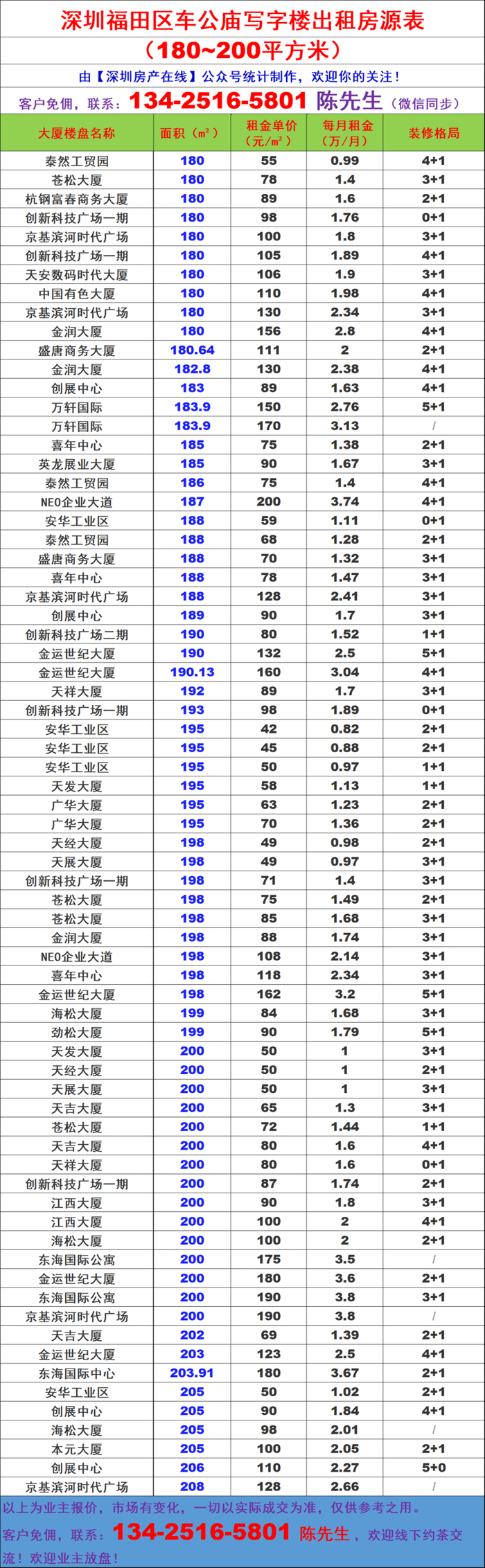 深圳福田区车公庙片区180-200平米写字楼出租招租赁信息