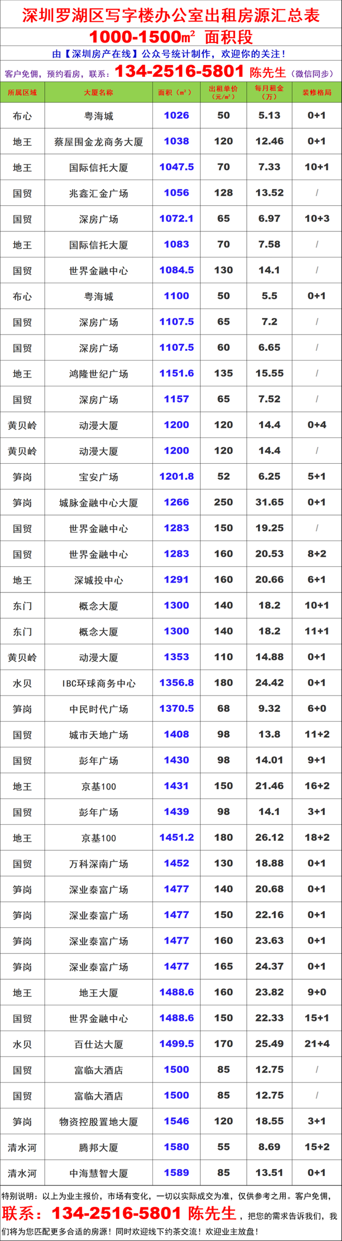 深圳罗湖区1000-1500平米写字楼出租招租赁信息