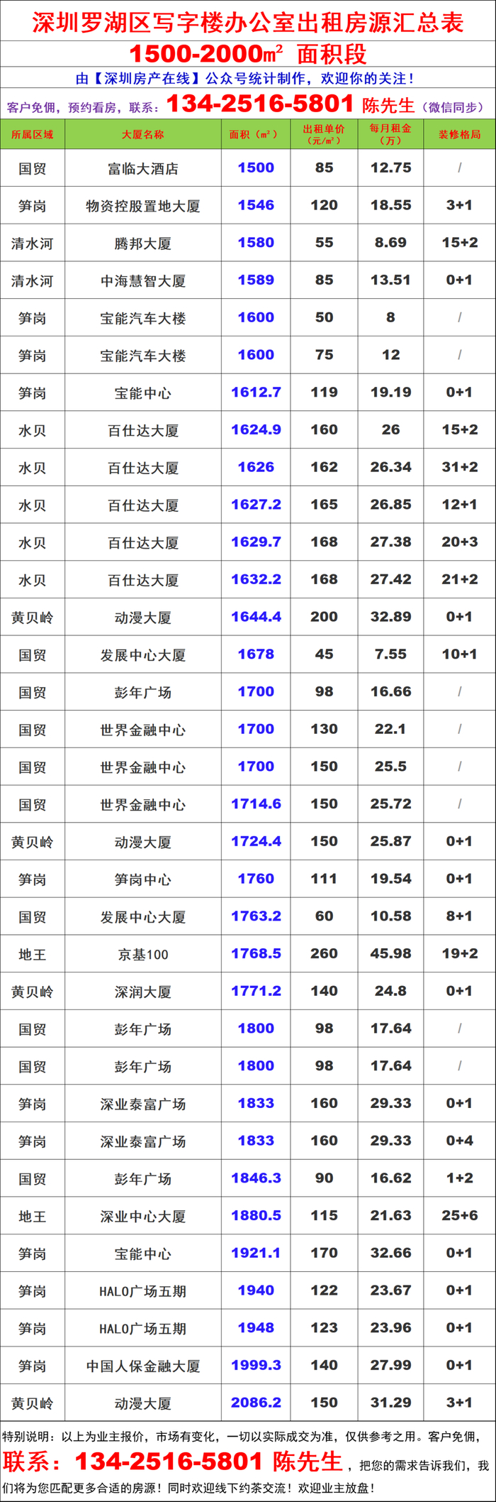 深圳罗胡区1500-2000平米办公室出租招租赁信息