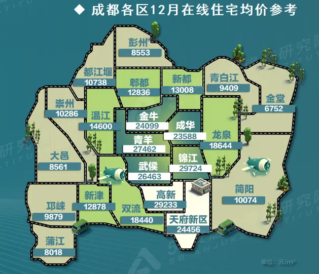 在房价表现上,上半年成都在线房源价格走势比较平稳,在1.2-1.3万/㎡的区间波动。下半年呈现上涨走势,第四季度在线房价约为1.4万/㎡。一直以来成都在线楼盘均价梯队分化明显,新房线上均价2万以上梯队被主城区和天府新区承包。近郊龙泉和双流领跑1万梯队。不过随着远郊改善大户型增多,部分远郊区域比如崇州、简阳、都江堰也先后跻身1万梯队行列。