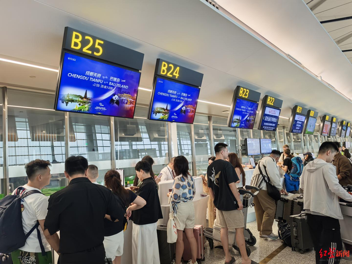 ▲乘坐成都直飞巴厘岛航班的旅客正在办理值机。图据川航“非常期待这次旅行,一共7天,我将在巴厘岛过国庆节。”9月26日下午,在成都天府国际机场T1航站楼出发大厅内,成都市民袁女士告诉红星新闻记者,当天下午由四川航空执飞的成都直达巴厘岛的国际航线正式开通,“以前没有成都直飞巴厘岛的航班,只能从中国香港转机,旅途要十几个小时,过于劳累。现在有了直飞航班,我第一时间买了票,去巴厘岛体验追赶海豚的乐趣。”