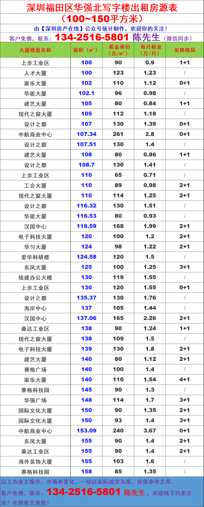 深圳福田区华强北片区100-150平米办公室出租招租赁信息