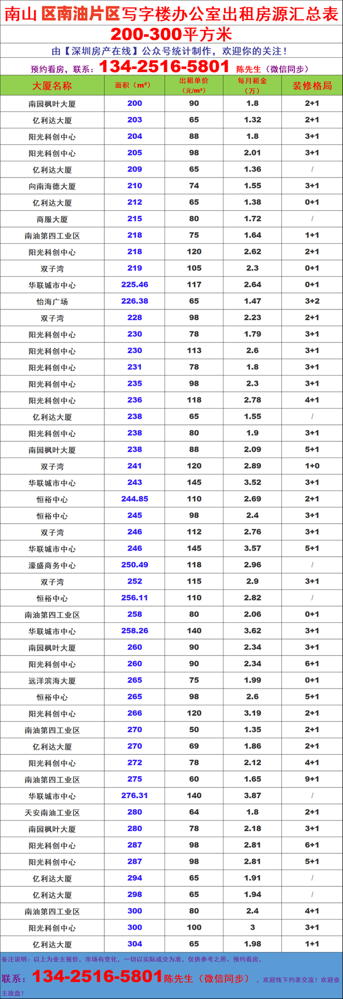 深圳南山区南油200-300平米办公室出租招租赁信息