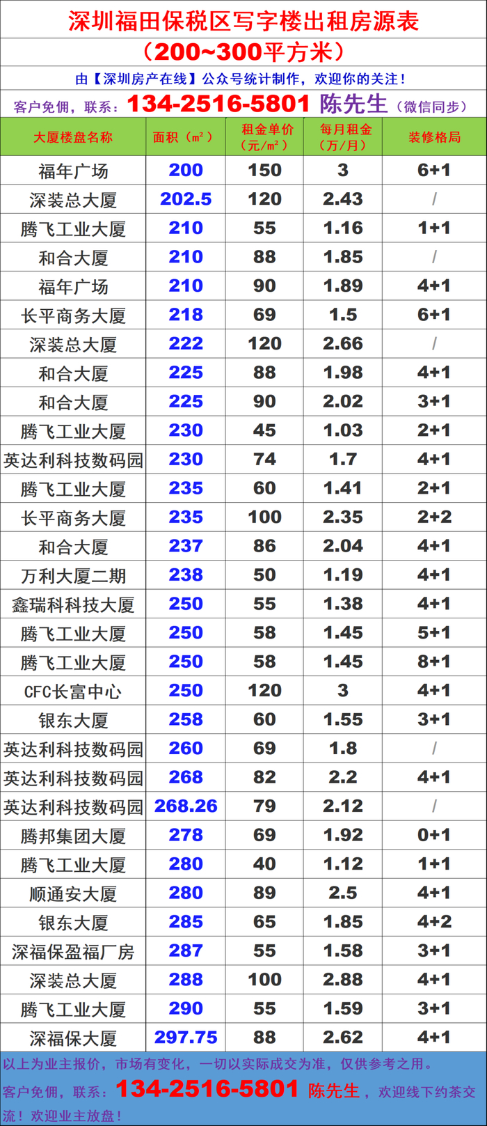 深圳福田保税区片区200-300平米办公室出租招租赁信息
