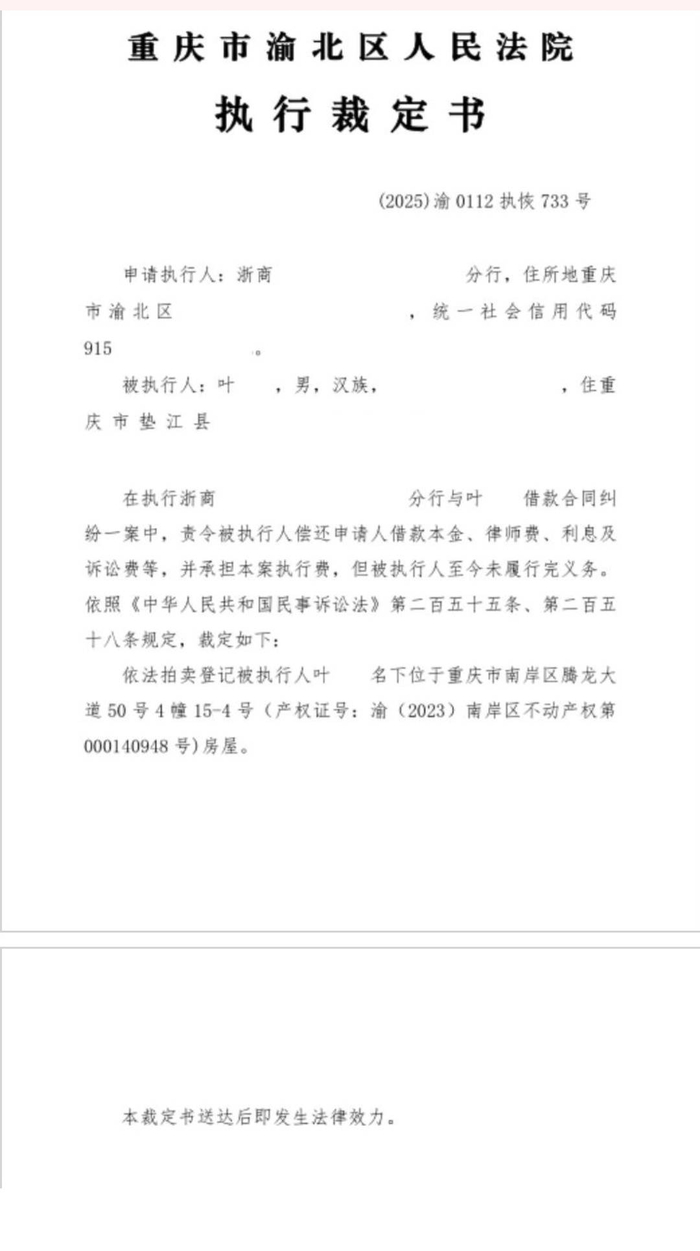 重庆市渝北区人民法院执行判定书。相关附件有重庆市渝北区人民法院执行判定书,其中写道:申请执行人为浙商银行,被执行人为男性叶某某。在借款合同纠纷一案中,叶某某未履行完义务,依法拍卖其名下这套房子。