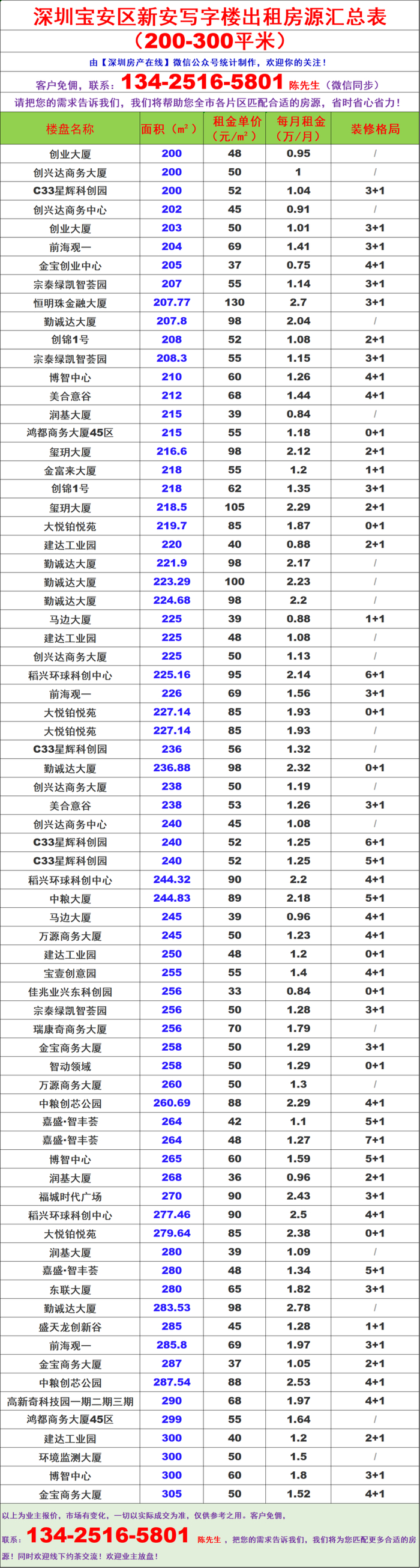 宝安区新安写字楼办公室出租房源信息表&租金价格表