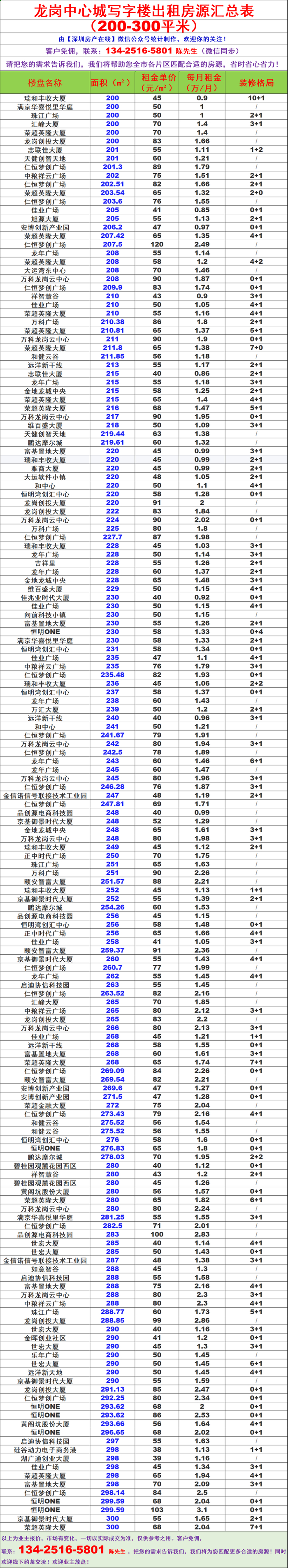 龙岗中心城片区写字楼办公室出租房源信息表&租金价格表