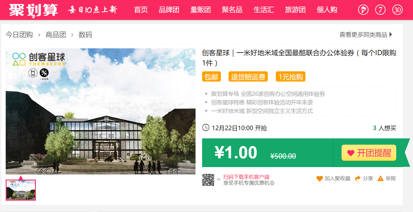 22日-25日,一米好地在聚划算推出联合办公位1元体验券,26个联合办公空间,500多个工位,任你体验!