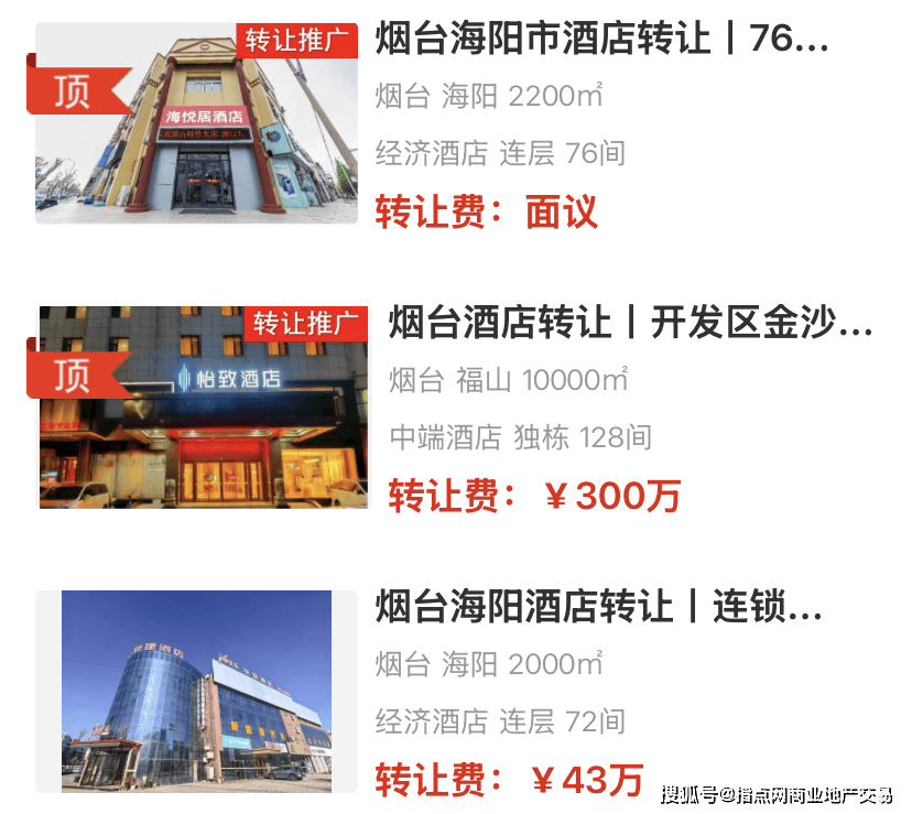 · 从转让门槛来看,除芝罘区 100 间独栋项目转让费 260 万元外,其余 3 宗经济型酒店转让费均在 43 万 - 90 万元之间,投资门槛相对较低,流动性较强。