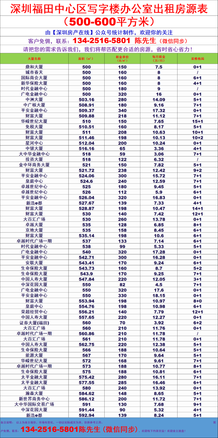 深圳福田中心区500-600平米写字楼出租招租赁信息