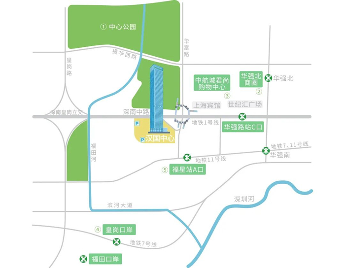 片区定位:汉国中心坐落于福田区华强北核心板块,这里是深圳最具活力的科技创新与商业中枢之一。片区定位为“环中心公园活力圈” + “河套深港科技创新合作区辐射带”,致力于打造集金融科技、人工智能、电子信息、跨境电商、高端服务于一体的国际化产城融合示范区。