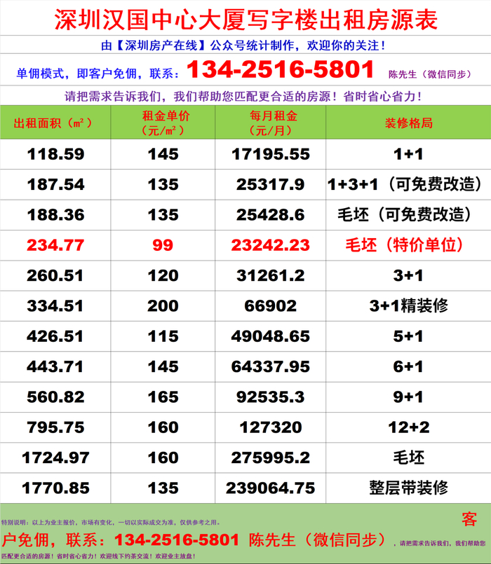 【深圳房产在线】陈先生:134-2516-5801 (微信同步)✅ 单佣模式,客户方免佣金✅ 提供专业选址建议、租赁谈判、合同审核全流程服务✅ 支持企业批量选址、代理招商、资产托管等全链条商务服务