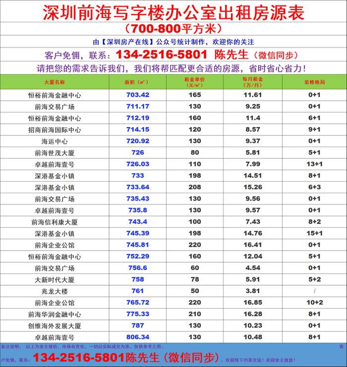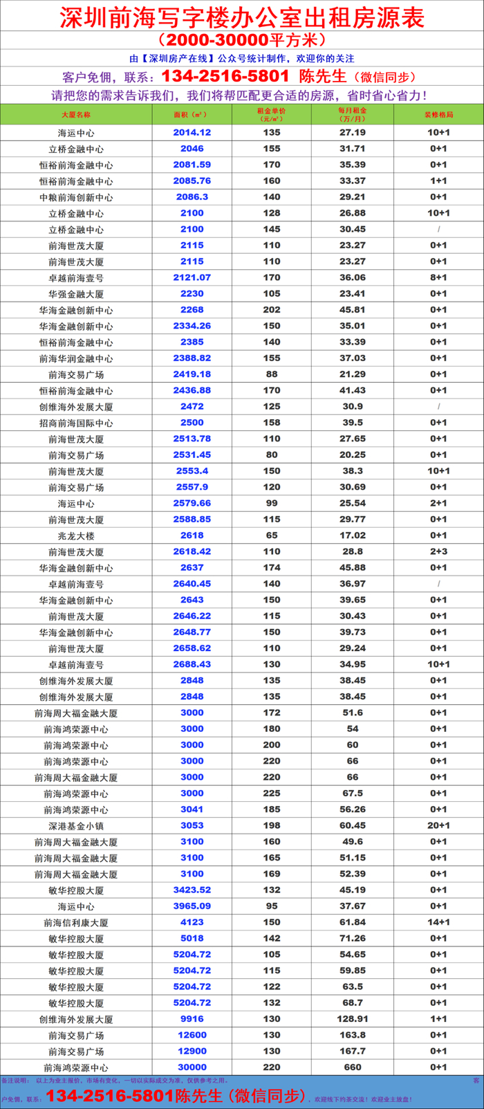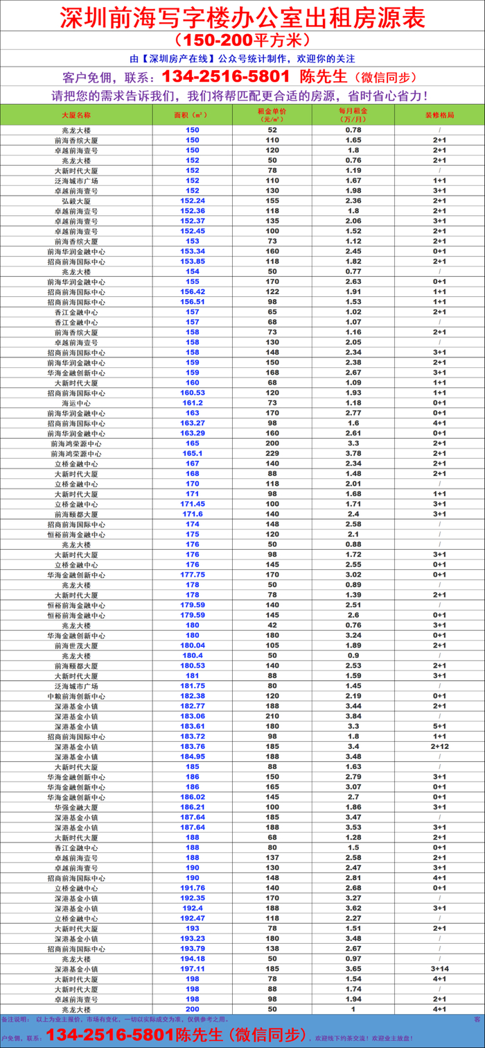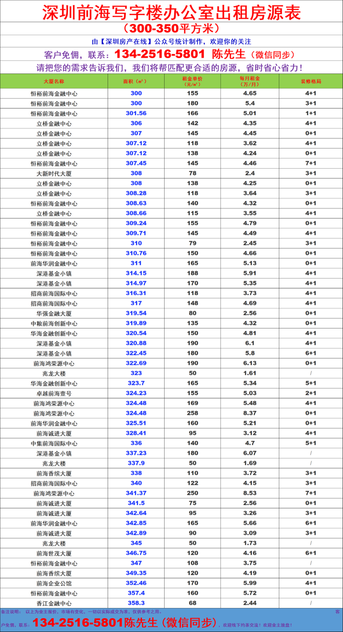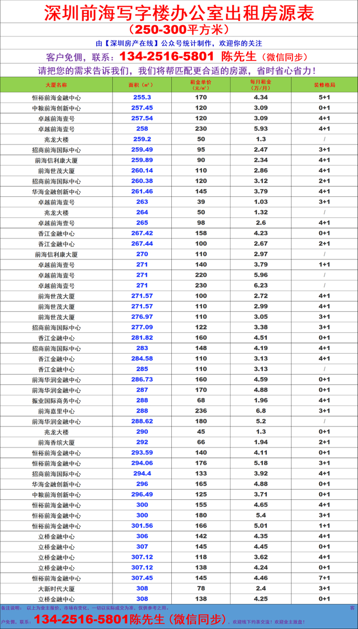 深圳前海写字楼办公室出租房源信息表&租金价格表
