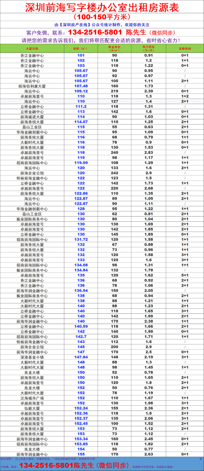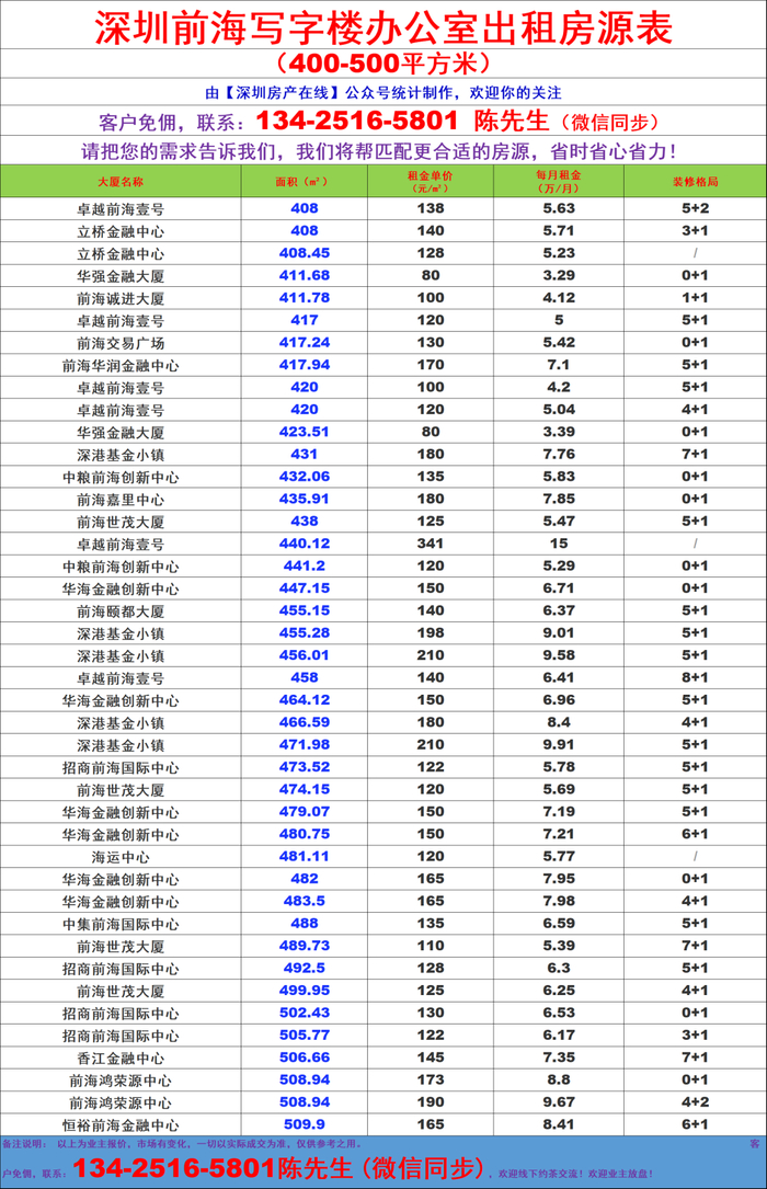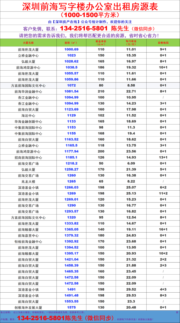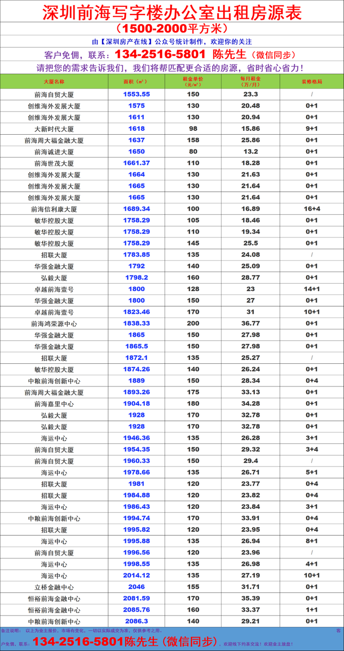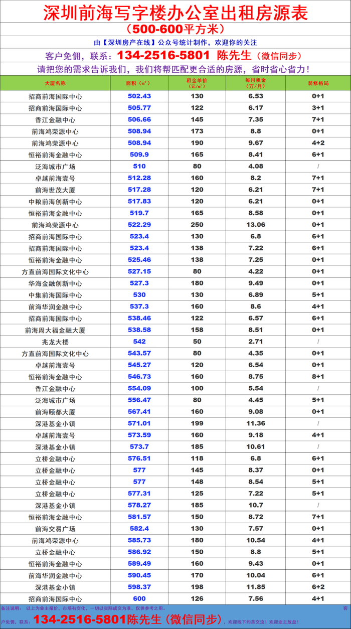 前海自贸区写字楼办公室出租房源信息表&租金价格表