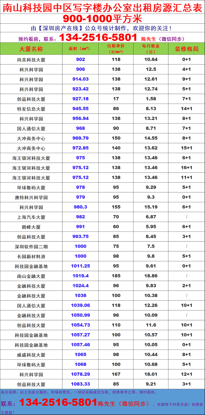 南山科技园中区900-1000平米写字楼出租招租赁信息