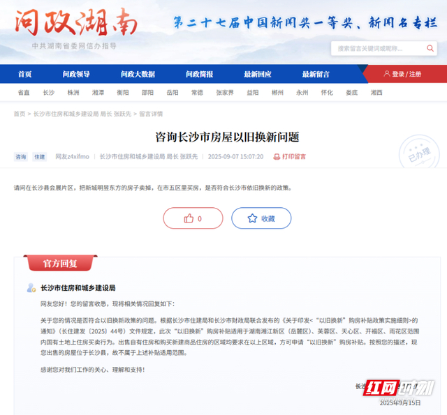 近日,有网友在红网《问政湖南》栏目咨询,将其位于长沙县会展片区的房屋出售,并在长沙市五区内购置新房,是否可享受“以旧换新”购房补贴政策。