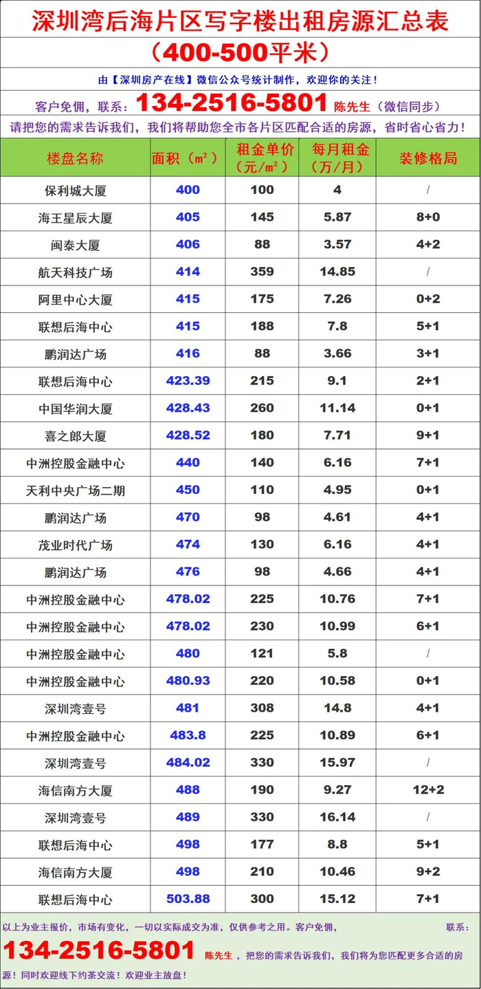 深圳湾后海400-500平米写字楼出租招租赁信息