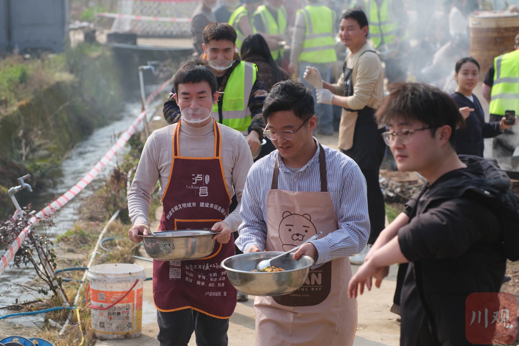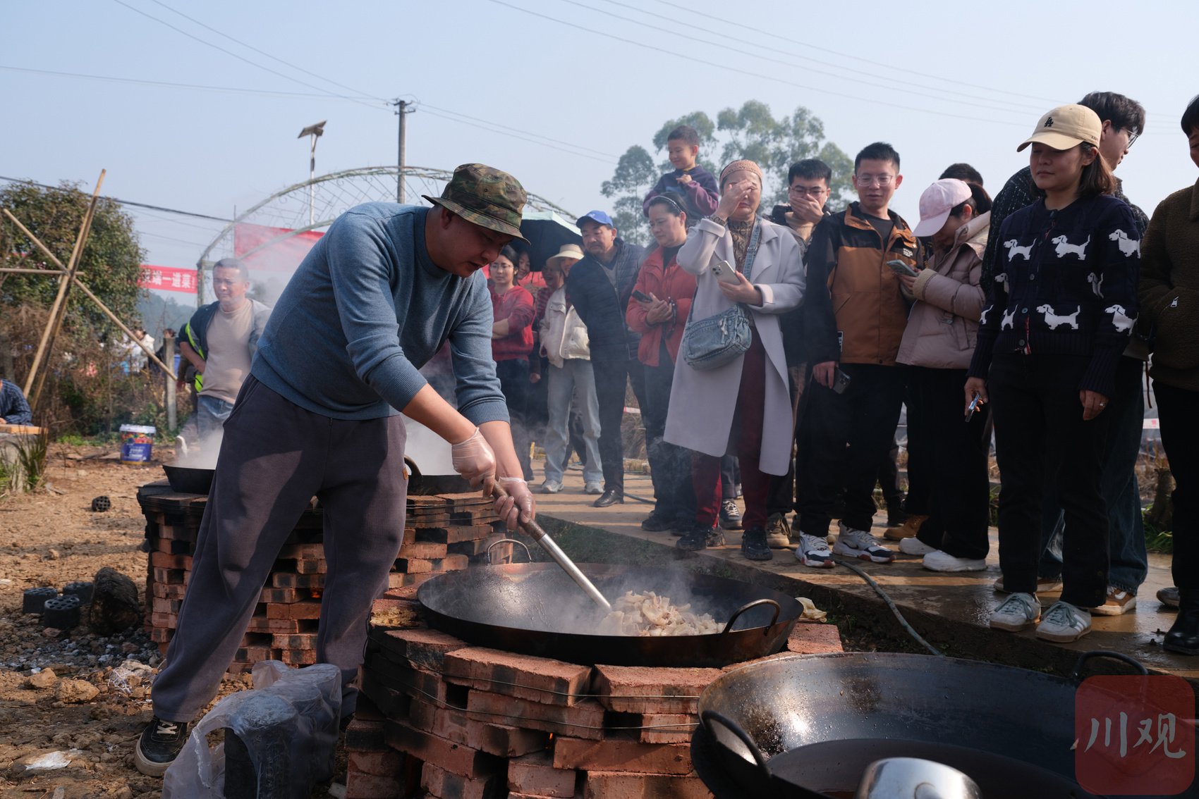 参与者自行端菜上桌。随着猪肉陆续处理完毕,大铁锅中的汤水翻滚蒸腾,香气扑鼻。酥肉在油锅里嗞嗞作响,回锅肉浓香四溢,炖猪蹄热气袅袅,肝腰合炒色泽油亮。有人翻炒时忆起儿时村里的杀猪宴,也有人领着孩子蹲在一旁,讲解“这就是过去的年味”。每一道工序都有网友参与:切菜、洗菜、掌勺、备料,每个人都在用行动贡献着一份力量。阳光洒在灶台,蒸汽缭绕,炊烟袅袅,整片场地笼罩在忙碌而温暖的氛围之中。