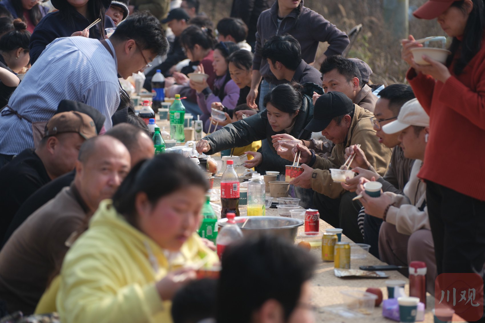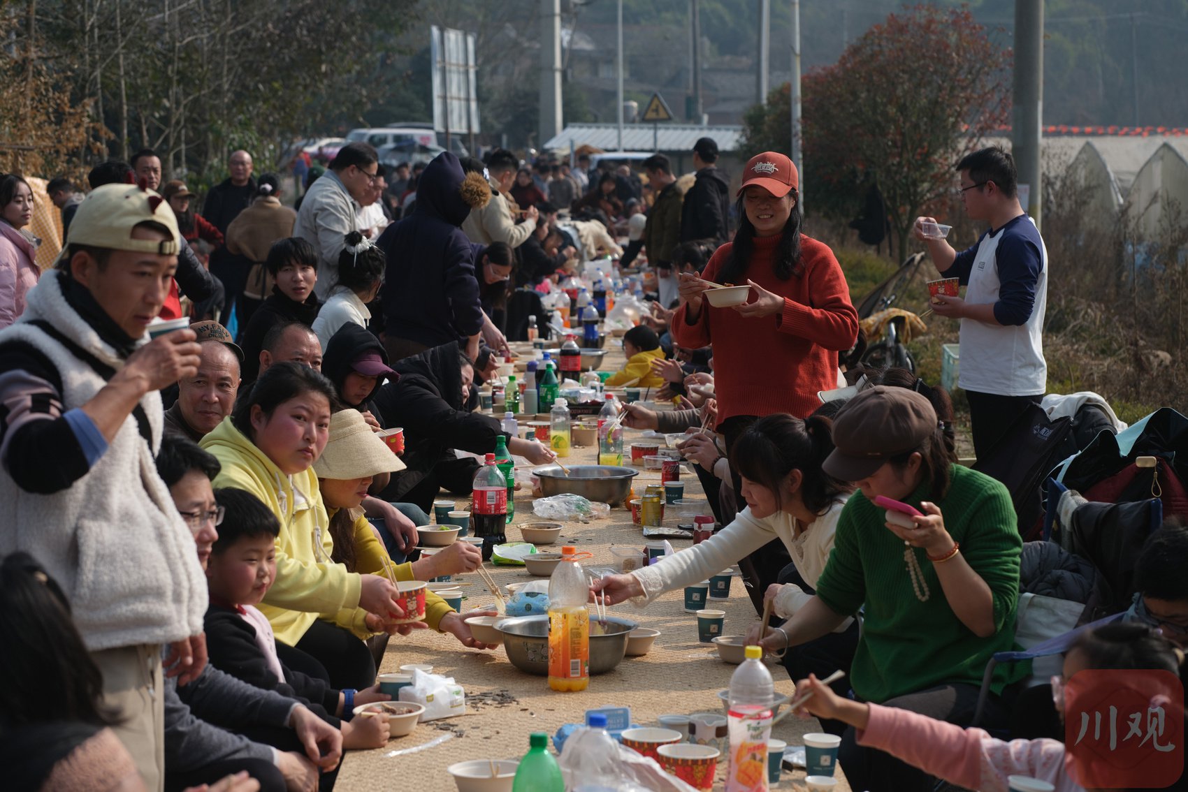 桌椅沿着小路摆开,市民冬日里尽享刨猪汤。桌椅沿田间小道依次排开,人们端碗排队,陆续入座。锅气、人声、笑语交织升腾,热闹中流淌着温情。年轻人主动搀扶老人、传递碗筷,孩子们在空地上欢快奔跑,老人们围坐笑谈,整个场面洋溢着浓郁的生活气息与邻里暖意。