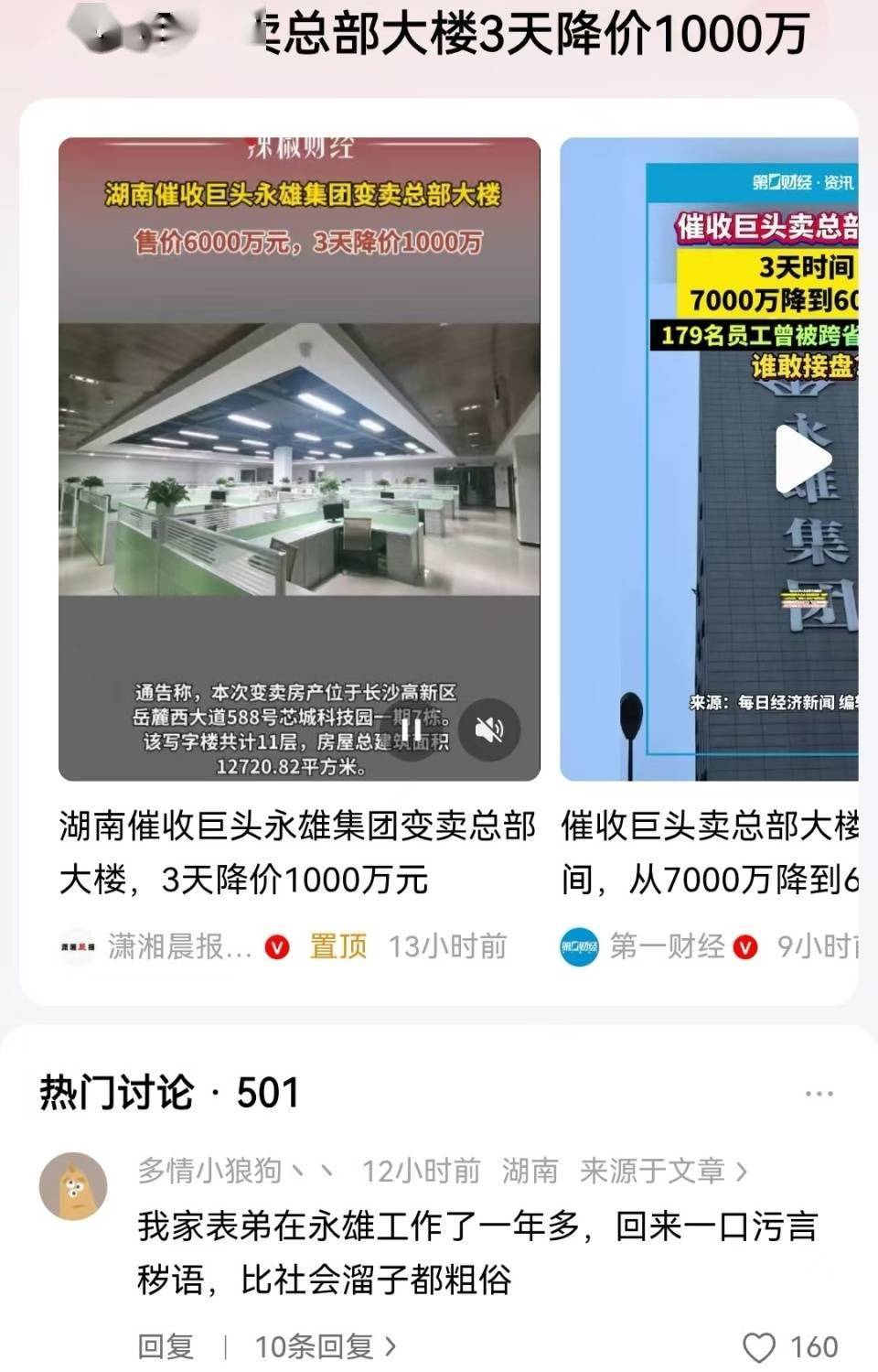 他们都是躲在哪里作业呢?从来电的号码上肯定是辨别不出来的,但是从不时出现的警方报道来看,全国各地催收公司都有。不过在好像催收市场一片繁荣的时候,过去的传统巨头却在陨落,曾经号称国内规模最大、催收人员过万、全国分支公司过百的湖南永雄集团,都开始卖办公楼了,而且没卖出去还在不断降价。