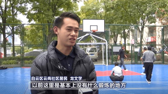 白云区云尚社区居民龙文学:以前这里基本上没有什么锻炼的地方,想去锻炼要到铝厂那边。现在很方便,楼下建了这个篮球场,下楼换上衣服就可以来打篮球,可以健身了。我们邻里之间沟通比较多了。
