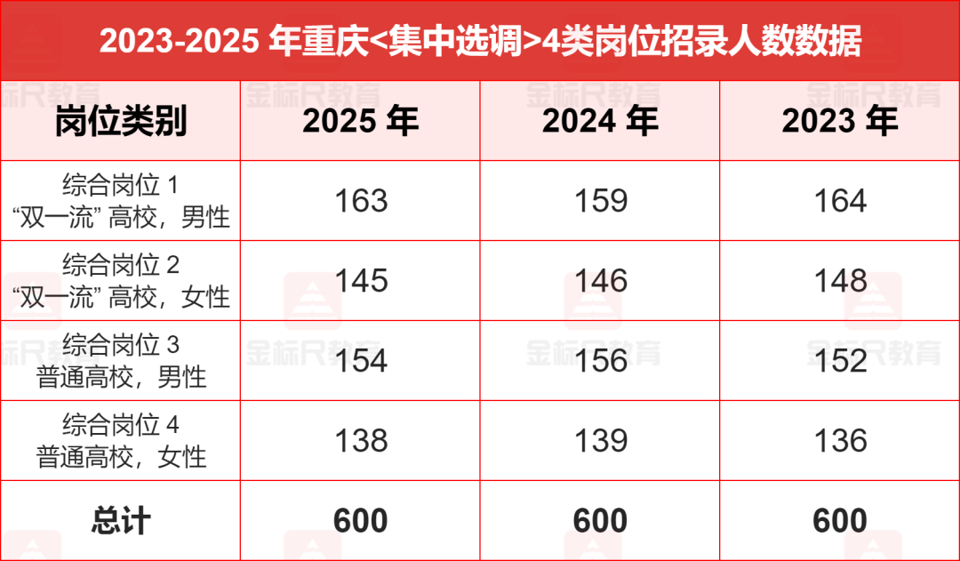 由上图可以看到,重庆集中选调生的招录人数,由之前招录400人增加到了600人,扩招50%,这个增幅还是蛮可观的。虽然与重庆公务员每年几千人的招录规模相比,重庆集中选调生的招录规模并不算大,但每年招录人数相对稳定。